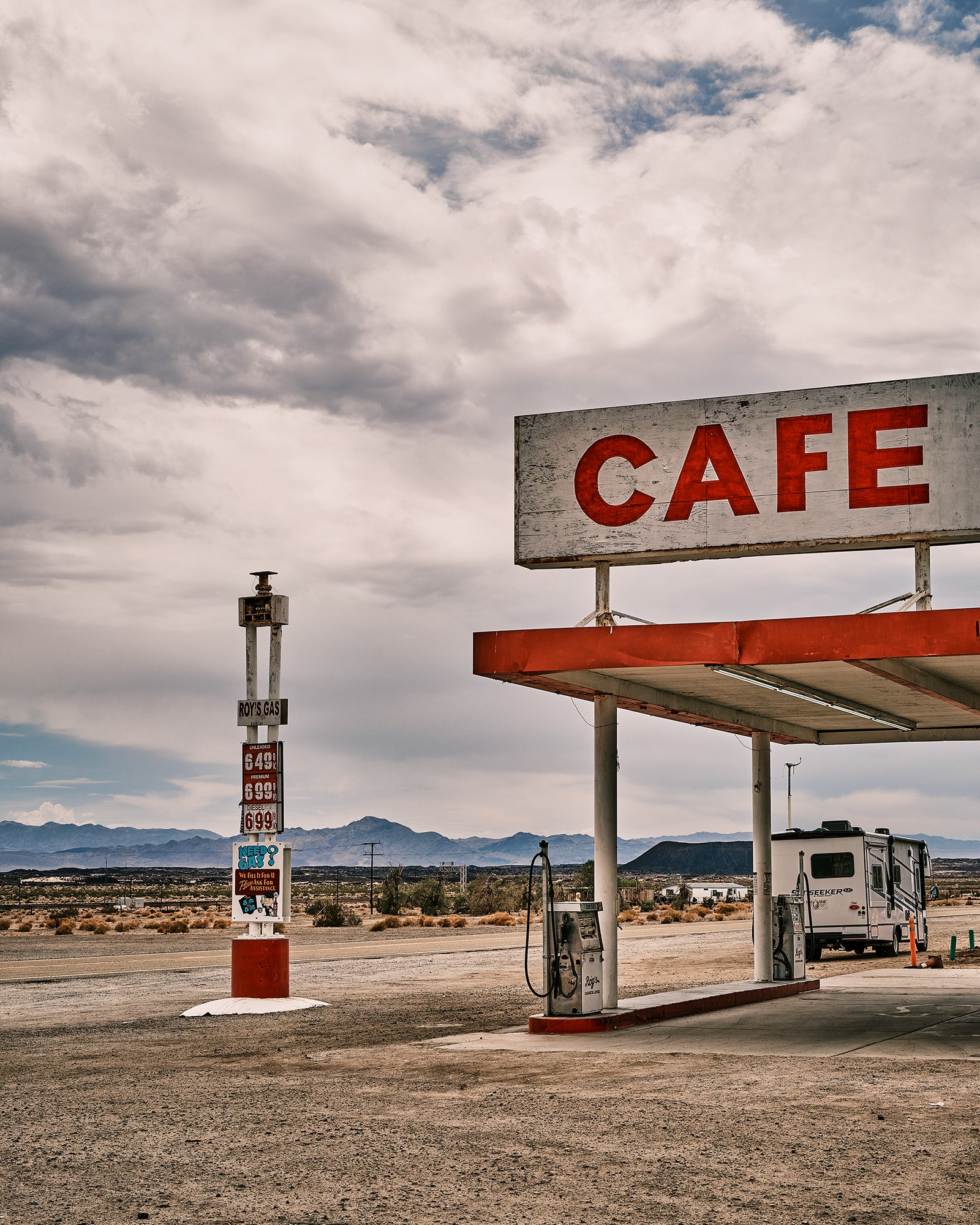 Route 66 et Roy’s Café : atmosphère rétro, désert et néon iconique. Une image mythique du road trip américain au cœur de la Californie.